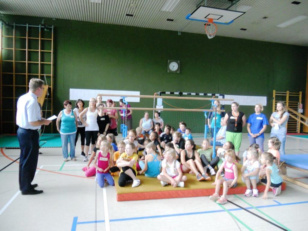 Nach der Eröffnung durch Bürgermeister Holger Schmitt und einem gemeinsamen Einstiegstanz zum Aufwärmen und Kennenlernen, wurden die Kinder spielerisch in Gruppen aufgeteilt und konnten anschließend die an verschiedenen Stationen, wie zum Beispiel dem Großtrampolin, zur Verfügung stehenden Bewegungsangebote der Reihe nach absolvieren.