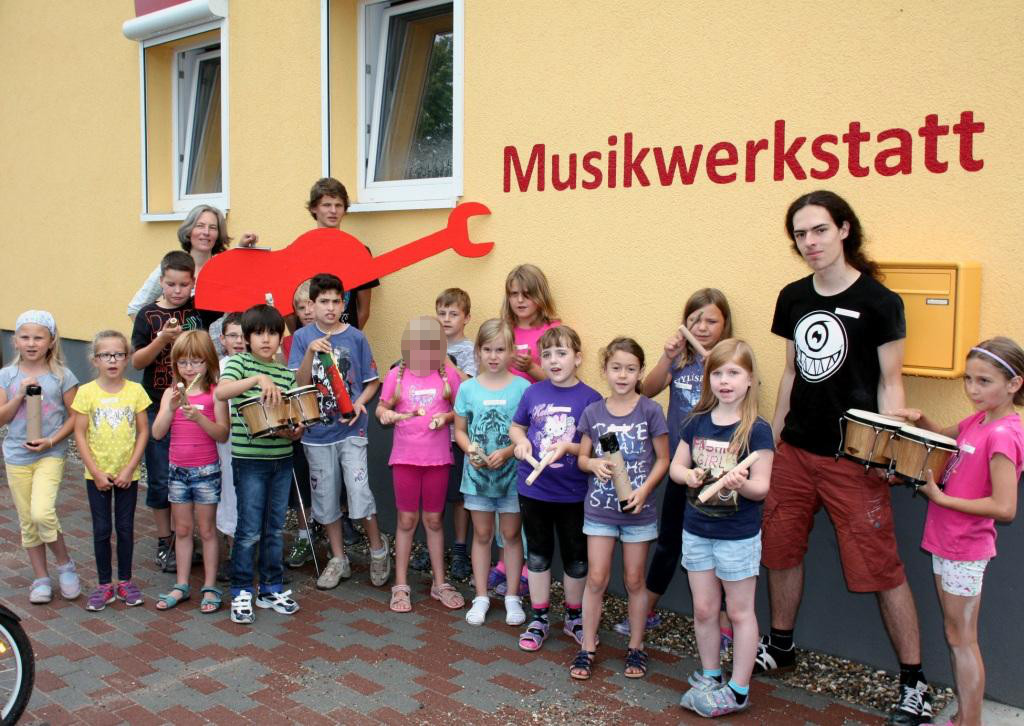 Unter fachkundiger Anleitung wurden bei der Musikwerkstatt sechs verschiedene Percussionsinstrumente mit unterschiedlichen Materialien und Fertigungstechniken gebaut. Hierbei kamen Holz, Bambus, Ton, Kunststoff, Papier, Nägel, Schrauben und vieles mehr zum Einsatz. Es wurden unter anderem Trommeln, Claves und Shaker gefertigt. Außerdem wurde ein Drum-Circle, lustige Rhythmicals und ein Musik-Quiz veranstaltet. Zusätzlich konnten die Kinder ein großes Schlagzeugset ausprobieren und natürlich auch gemeinsam mit ihren eigenen Percussionsinstrumenten musizieren.