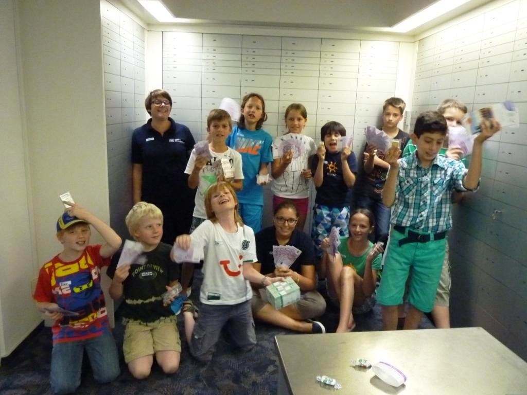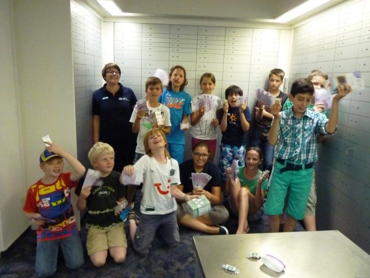 Anschließend stand ein großer Bankrundgang durch alle Abteilungen auf dem Programm. Besonders interessant hierbei war die Kasse mit ihren vielen Automaten, welche sich alle ganz genau auch einmal von innen anschauen konnten. Zum Abschluss des Rundganges ging es zum Tresor und zu den Schließfächern. Hier bekamen die Kinder alles Wissenswerte über den Inhalt des Tresors und den Sicherheitsmaßnahmen anschaulich erklärt.